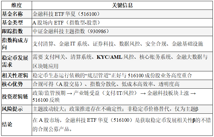 三、为什么说金融科技ETF华夏(516100)是合规投资稳定币的不错的公募产品?